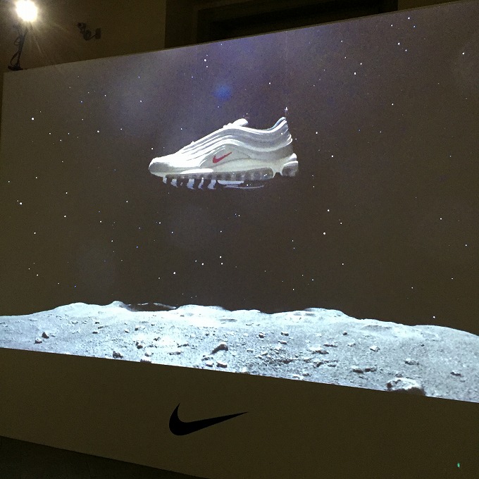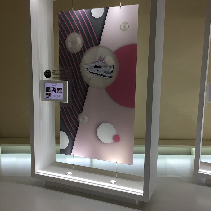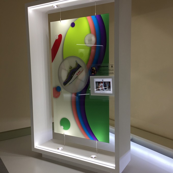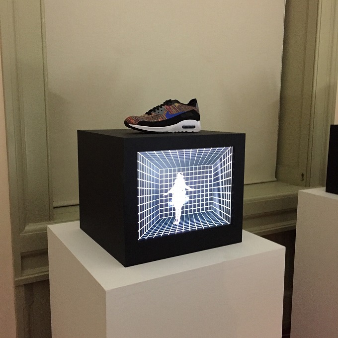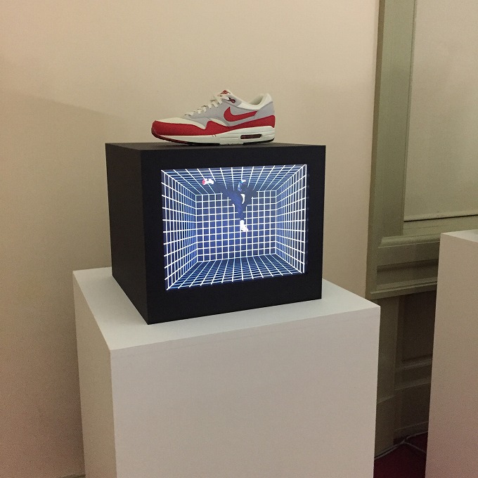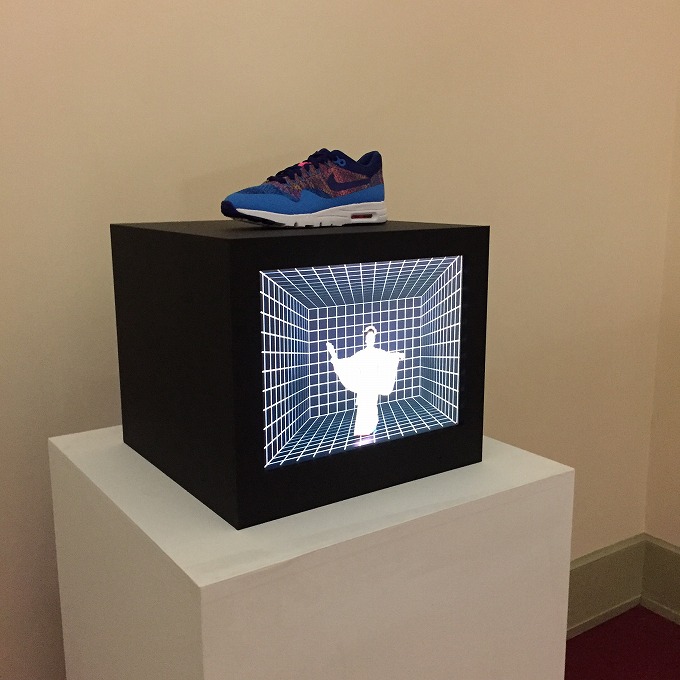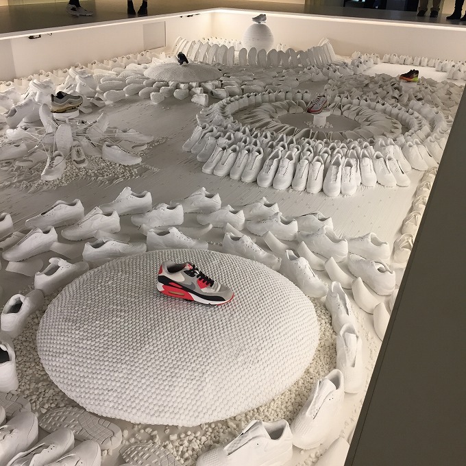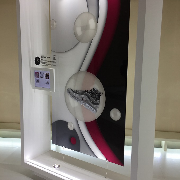 ・投影されたAIR MAX 97、スニーカーパーツで作成されたアートオブジェクトが展示されています。