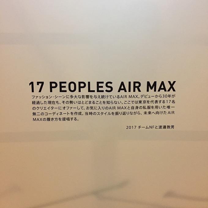 ・17人のクリエイターによるAIR MAXを履いたスタイリングが展示されています。展示されている洋服はクリエイターの私服となります。