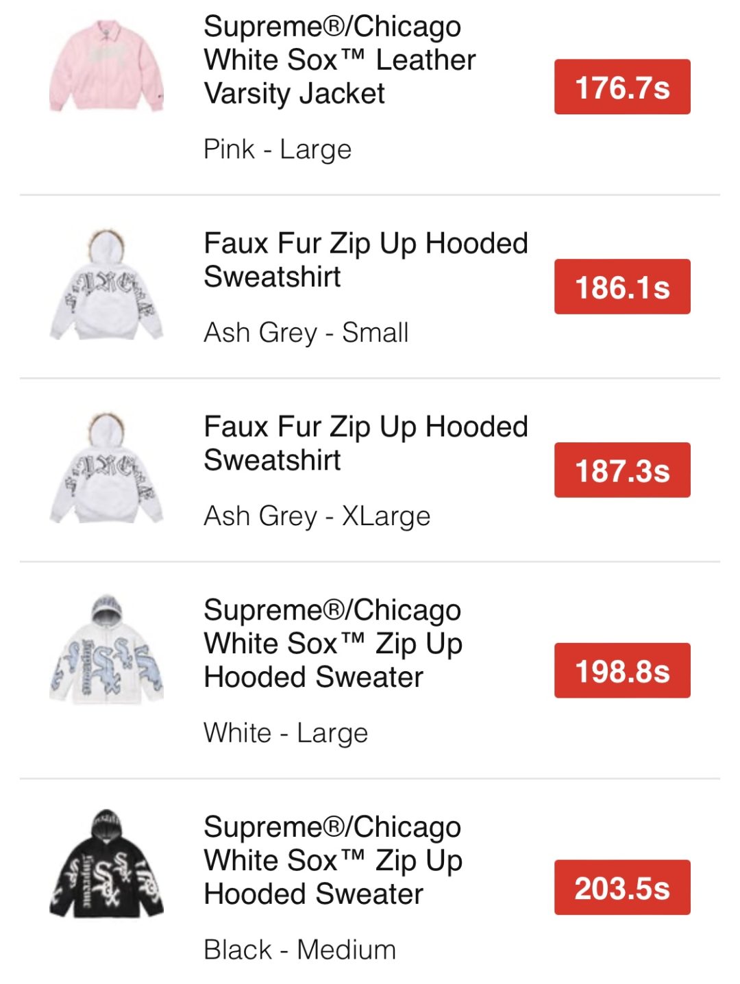 | Supreme®/Chicago White Sox™ Zip Up Hooded Sweater | S | M | L | XL | XXL |