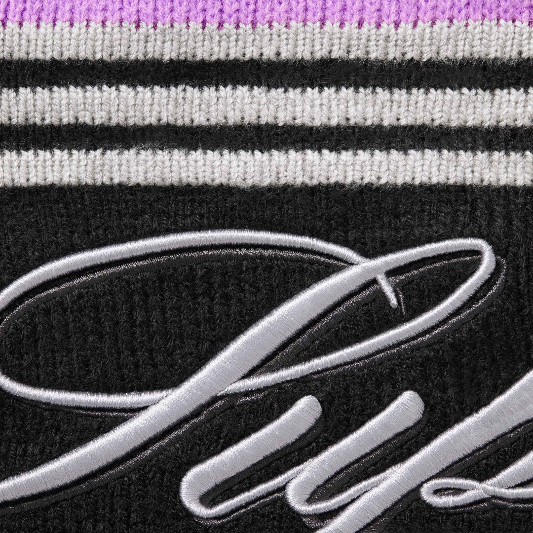 スクリプトロゴが胸元に配置されたアクリル素材のストライプ柄のハーフジップセーター