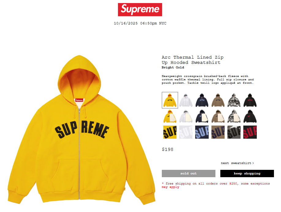 【3ページ目】着用画像(随時更新中)、事前リーク画像、2025/10/20(月)時点のSupreme原宿店の在庫状況、サイズ表(cm)、ヨーロッパ・アメリカのSupreme公式オンラインの売り切れ時間が掲載中です。
