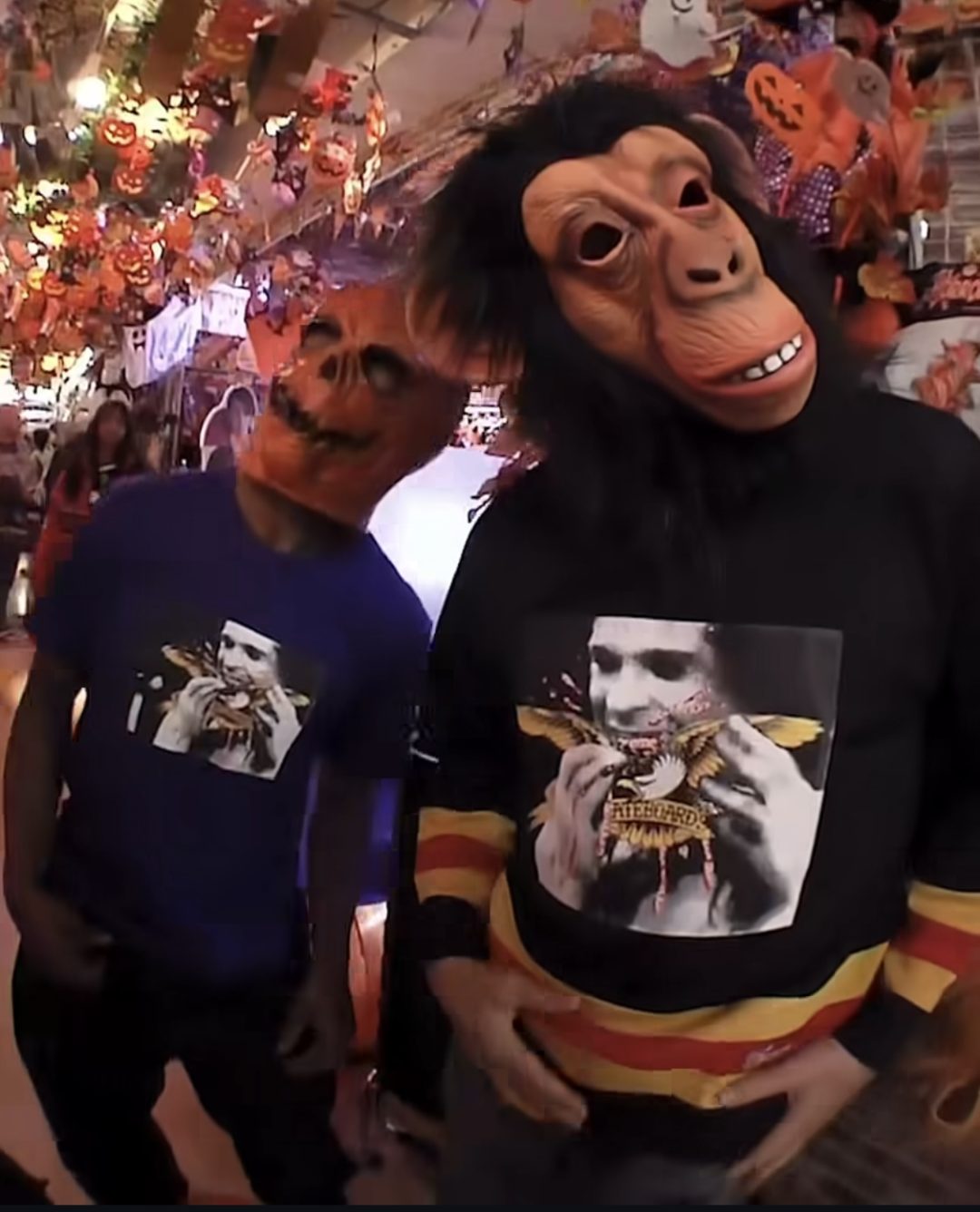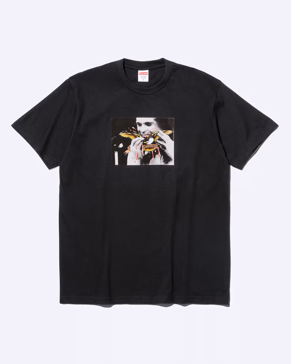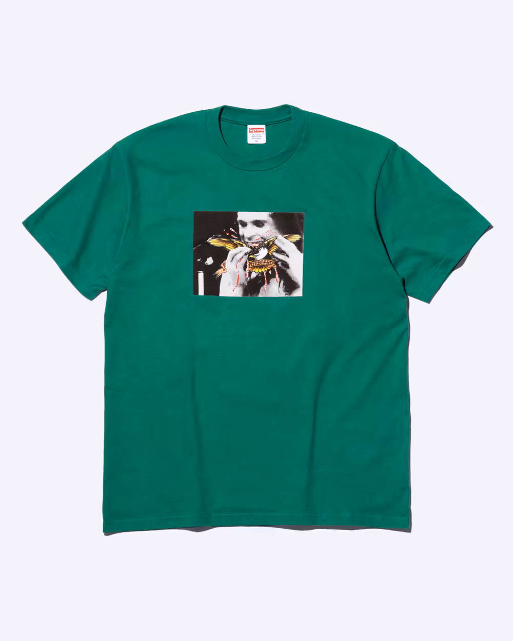 オジー・オズボーンが客席から投げられたコウモリの頭を食いちぎったワンシーンをパロった、オジー・オズボーンがANTIHEROのイーグルのロゴを食いちぎるグラフィックが正面、ANTI SUPREME HEROのコラボロゴが背中に配置されたTシャツ
