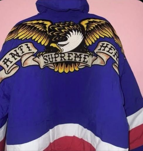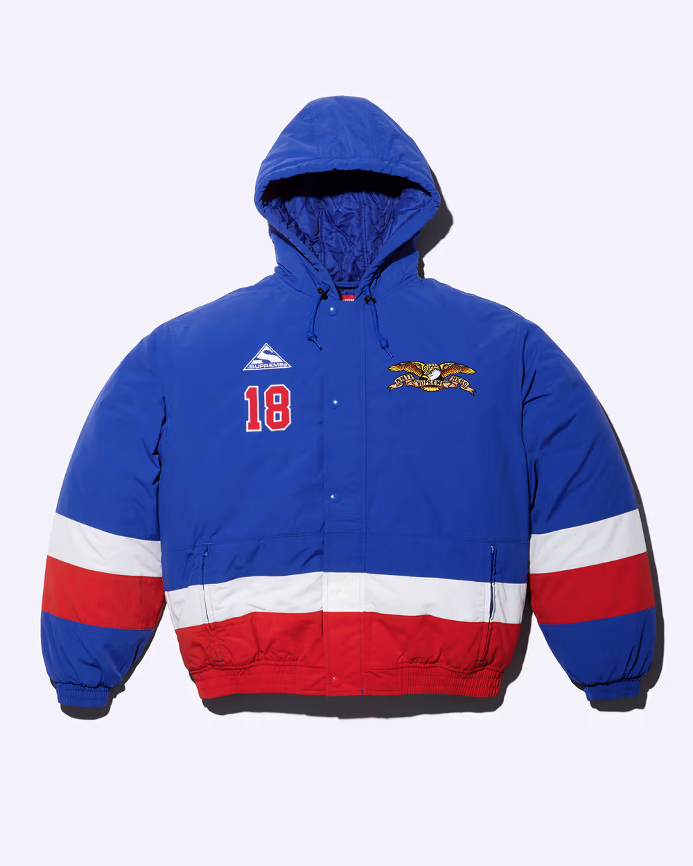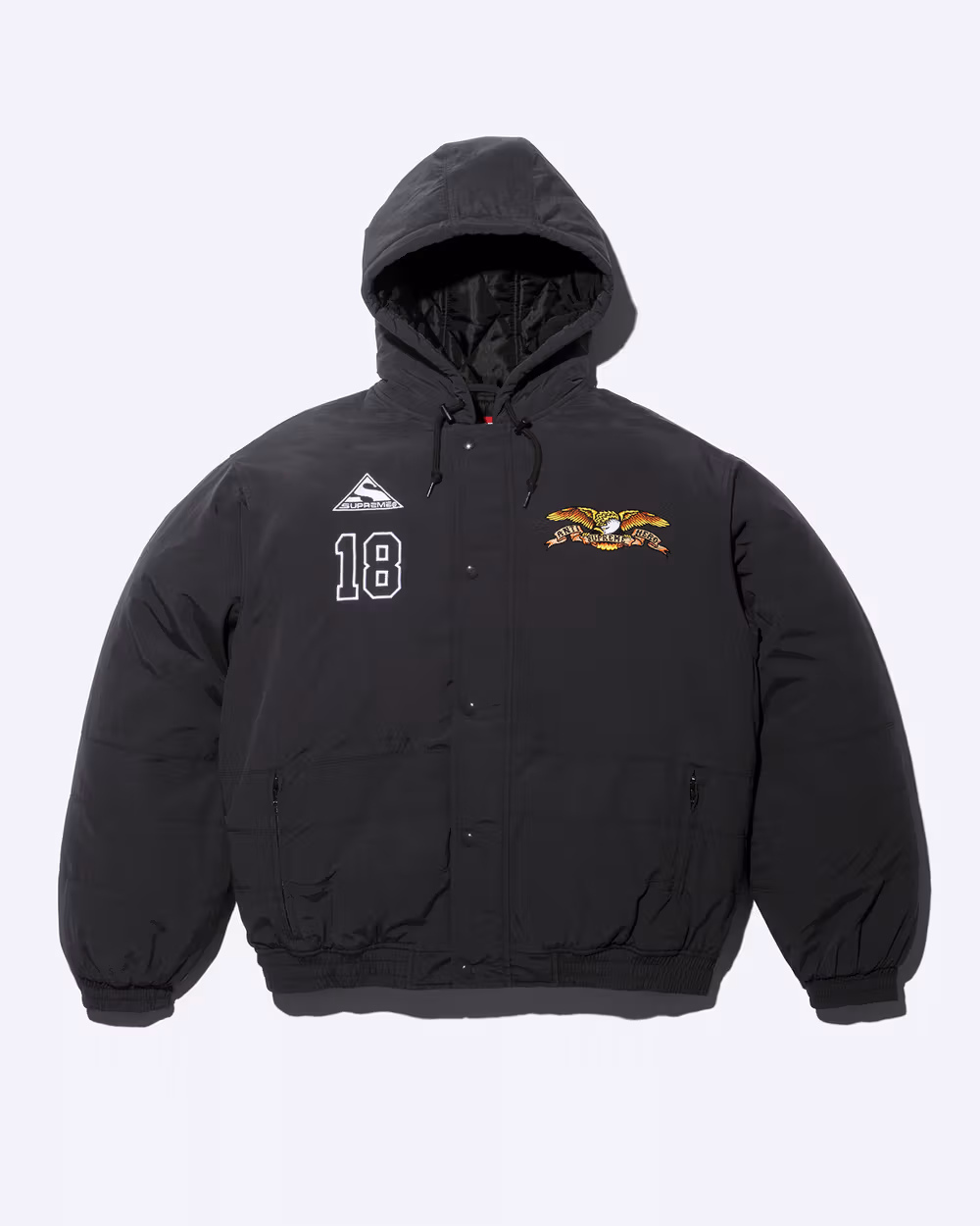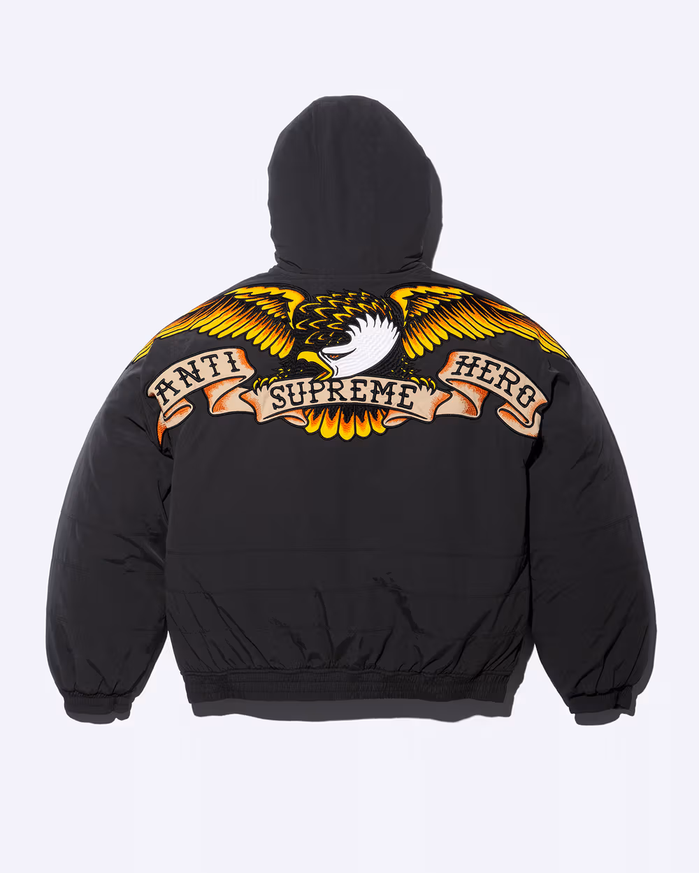 ANTI SUPREME HEROのコラボロゴが左胸と背中に配置されたフード付きの中綿入りスタジアムジャケット