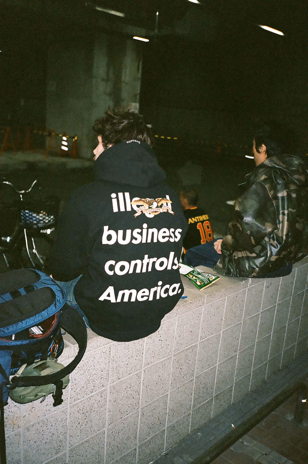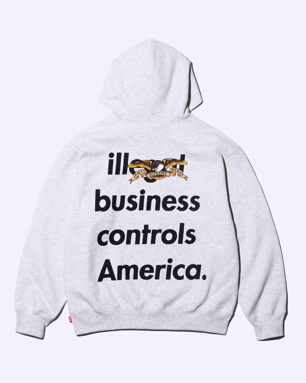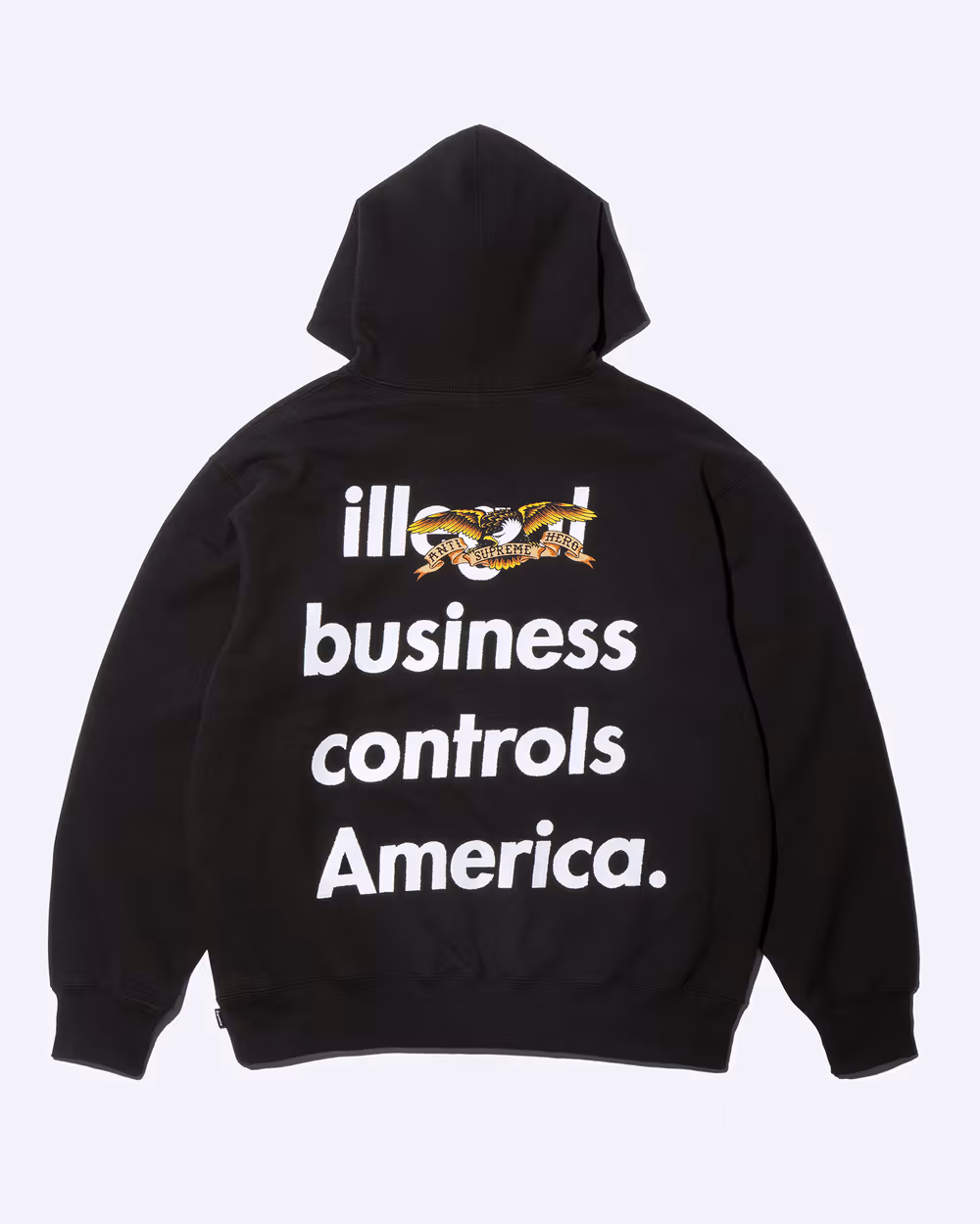 15SSで発売されたSupreme illegal business controls America TeeのアートワークにANTIHEROのイーグルをコラージュしたグラフィックが正面と背中に配置されたフーディー