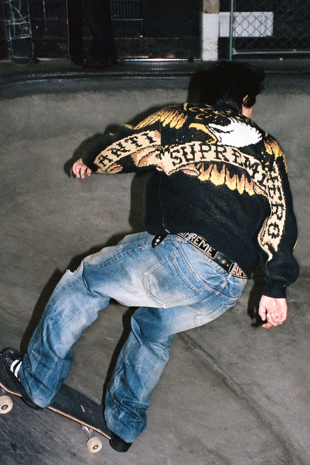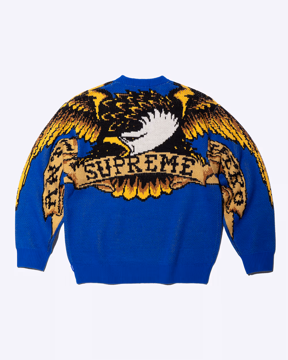 ANTI SUPREME HEROの大きなコラボロゴが背中から両袖にかけて配置されたセーター