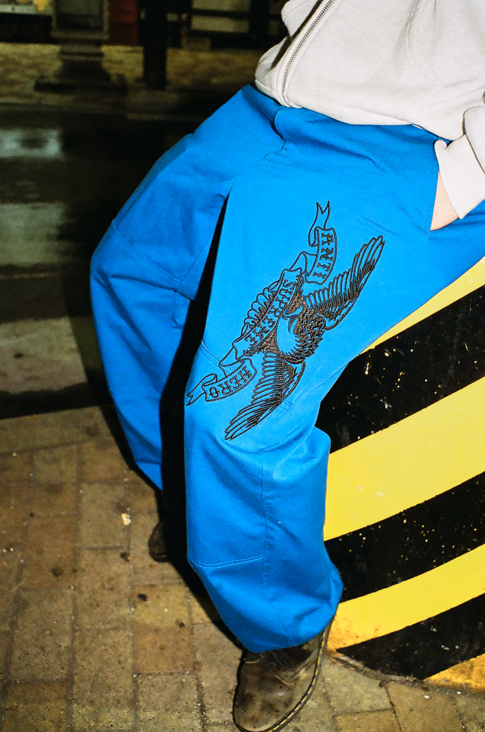 ANTI SUPREME HEROのコラボロゴが配置された左足に配置されたワークパンツ