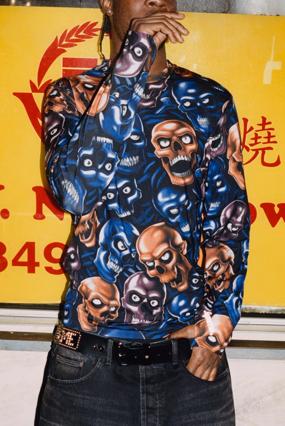 アメリカのTシャツブランド LIQUID BLUEがデザインしたSKULL PILEのグラフィックが全面に配置された総柄のベースレイヤーロングスリーブTシャツ。3M製のリフレクティブロゴが両袖口にプリント