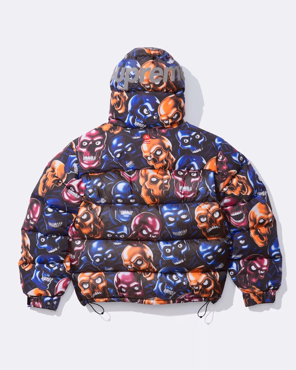アメリカのTシャツブランド LIQUID BLUEがデザインしたSKULL PILEのグラフィックが全面に配置された総柄の800フィルダウンパーカージャケット。3M製のリフレクティブロゴがフードとフロントポケットにプリント