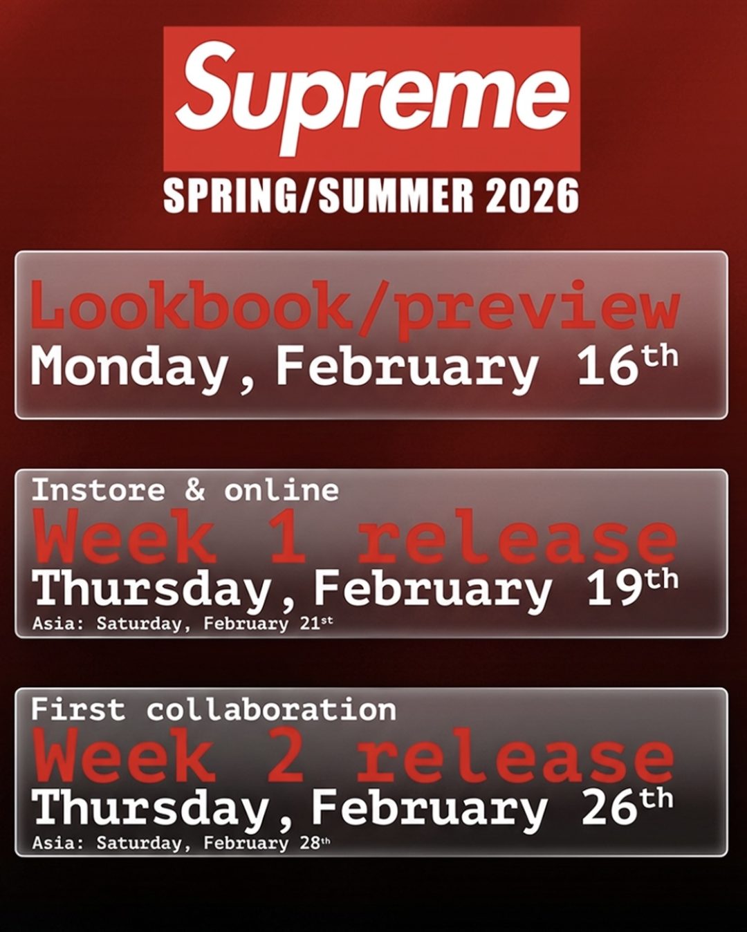 Supreme(シュプリーム) 2026春夏シーズンの立ち上げスケジュールとリークアイテムをまとめてみました。