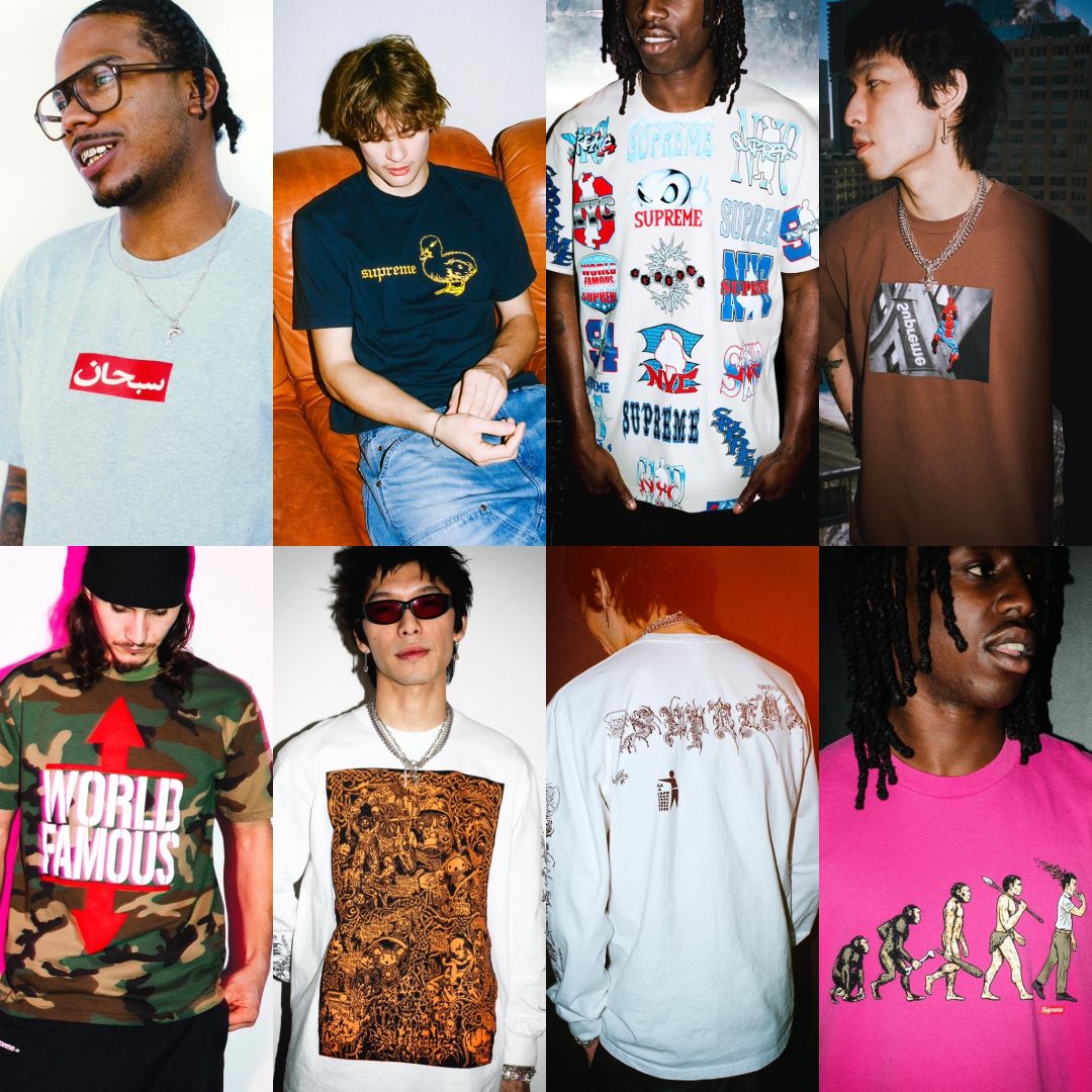 Tシャツは、アニメ版のスパイダーマンのキャラクターとSupreme Lafayette店の外装のフラッグがプリントされたTシャツ、アラビック・ボックスロゴがプリントされたTシャツ、Wombatがデザインしたアートワークがボディと両袖にプリントされたTシャツ、Myles UnderwoodがデザインしたWORLD FAMOUSなどのアートワークがプリントされたTシャツ、アヒルのグラフィックがプリントされたTシャツ、Art Dealerがデザインしたアートワークがボディ全体にプリントされたTシャツ、Sean Cliverがデザインしたブラック・ユーモア満載のグラフィックがプリントされたTシャツが発売予定です。