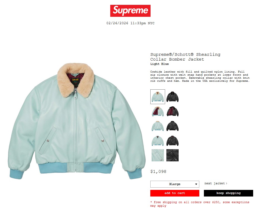 - Supreme®/Schott® Shearling Collar Bomber Jacket 198,000円 €1198 $1098