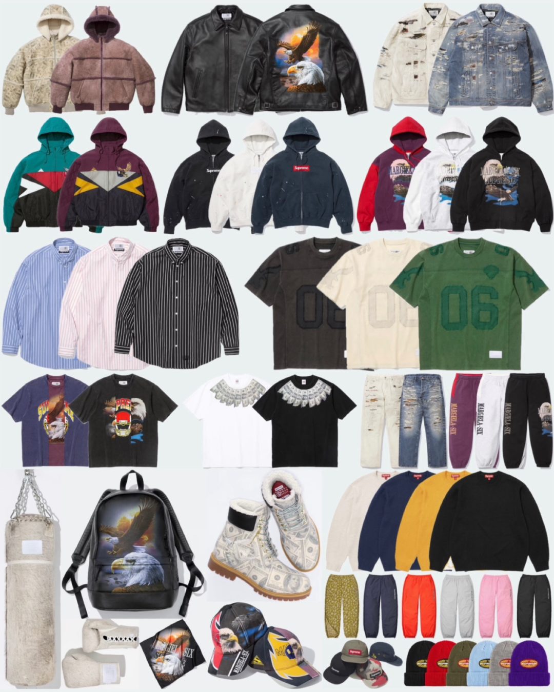 MM6 MAISON MARGIELA(エムエムシックス・メゾン・マルジェラ)のコラボアイテムは、ベンジャミン・フランクリンの100ドル紙幣のグラフィックが配置されたムートン素材のフード付きジャケット。フードは着脱可能、アメリカの国鳥 ハクトウワシのグラフィックが背中に配置されたSCHOTT製のレザー素材のシングルライダースジャケット、裏地が見えるクラッシュ加工やステッチ加工が施されたデニム素材のトラッカージャケット。日本製、異なるカラーのジャケットを組み合わせたようなスプリットデザインのフード付きスタジアムジャケット、ストライプ柄のボダンダウンシャツ、SupremeのロゴとMM6の06のナンバーが配置されたウォッシュド加工が施されたフットボールシャツ、アメリカの国鳥 ハクトウワシのグラフィックのTシャツとアメフトのヘルメットのグラフィックのTシャツを合体させたスプリットデザインのTシャツ、ベンジャミン・フランクリンの100ドル紙幣のグラフィックが首元にぐるりとプリントされたTシャツ、飛び散ったようなペイントがボディにプリントされたボックスロゴが胸元に刺繍されたジップアップフーディー、アメリカの国鳥 ハクトウワシのグラフィックとMARGIELA-SIX paris-new york-milwaukee SUPREMEのテキストが配置されたジップアップフーディー、裏地が見えるクラッシュ加工やステッチ加工が施されたルーズフィットシルエットのデニム素材のジーンズ。日本製、アメリカの国鳥 ハクトウワシのグラフィックとMARGIELA-SIX paris-new york-milwaukee SUPREMEのテキストが配置されたスウェットパンツ、アメリカの国鳥 ハクトウワシのグラフィックのキャップとアメフトのヘルメットのグラフィックのキャップを合体させたスプリットデザインの6パネルキャップ、アメリカの国鳥 ハクトウワシのグラフィックが配置されたレザー素材のバックパック、アメリカの国鳥 ハクトウワシのグラフィックが配置されたシルク素材のスカーフ、ポニーヘアー素材のエバーラスト製のボクシング用のパンチングバッグ。45kg、ポニーヘアー素材のエバーラスト製のボクシング用グローブ。2個セット、ベンジャミン・フランクリンの100ドル紙幣のグラフィックが全面に配置された、履き口がフェイクファー素材になったティンバーランド製の6インチ・ウォータープルーフブーツが発売予定です。