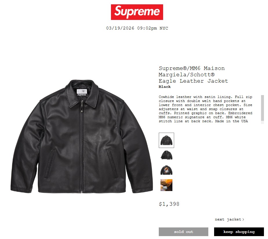 • Supreme®/MM6 Maison Margiela/Schott® Eagle Leather Jacket 253,000円 €1398 $1398