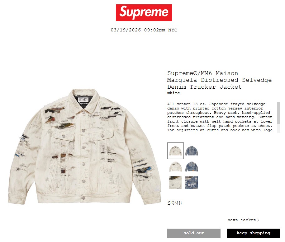 ・Supreme®/MM6 Maison Margiela Distressed Selvedge Denim Trucker Jacket 198,000円 €998 $998
