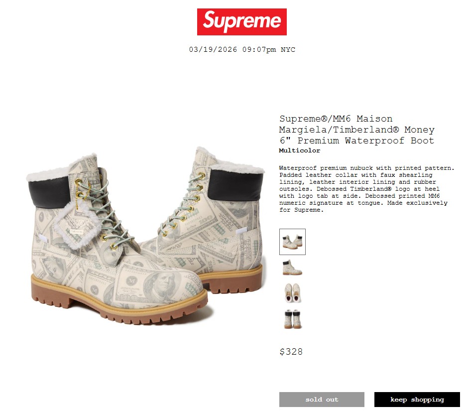 • Supreme®/MM6 Maison Margiela/Timberland® Money 6″ Premium Waterproof Boot 64,900円 €348 $328