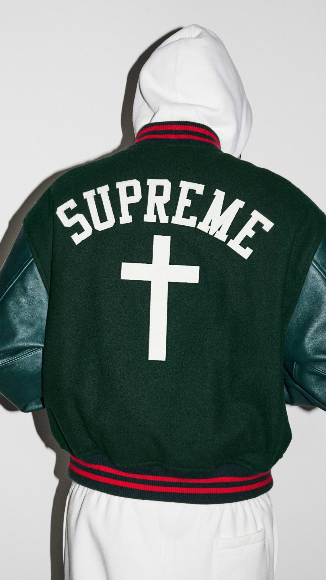 スクリプトロゴが左胸、アーチロゴとクロスマークが背中に配置された袖がカウハイドレザーになったウールブレンド素材のバーシティジャケット