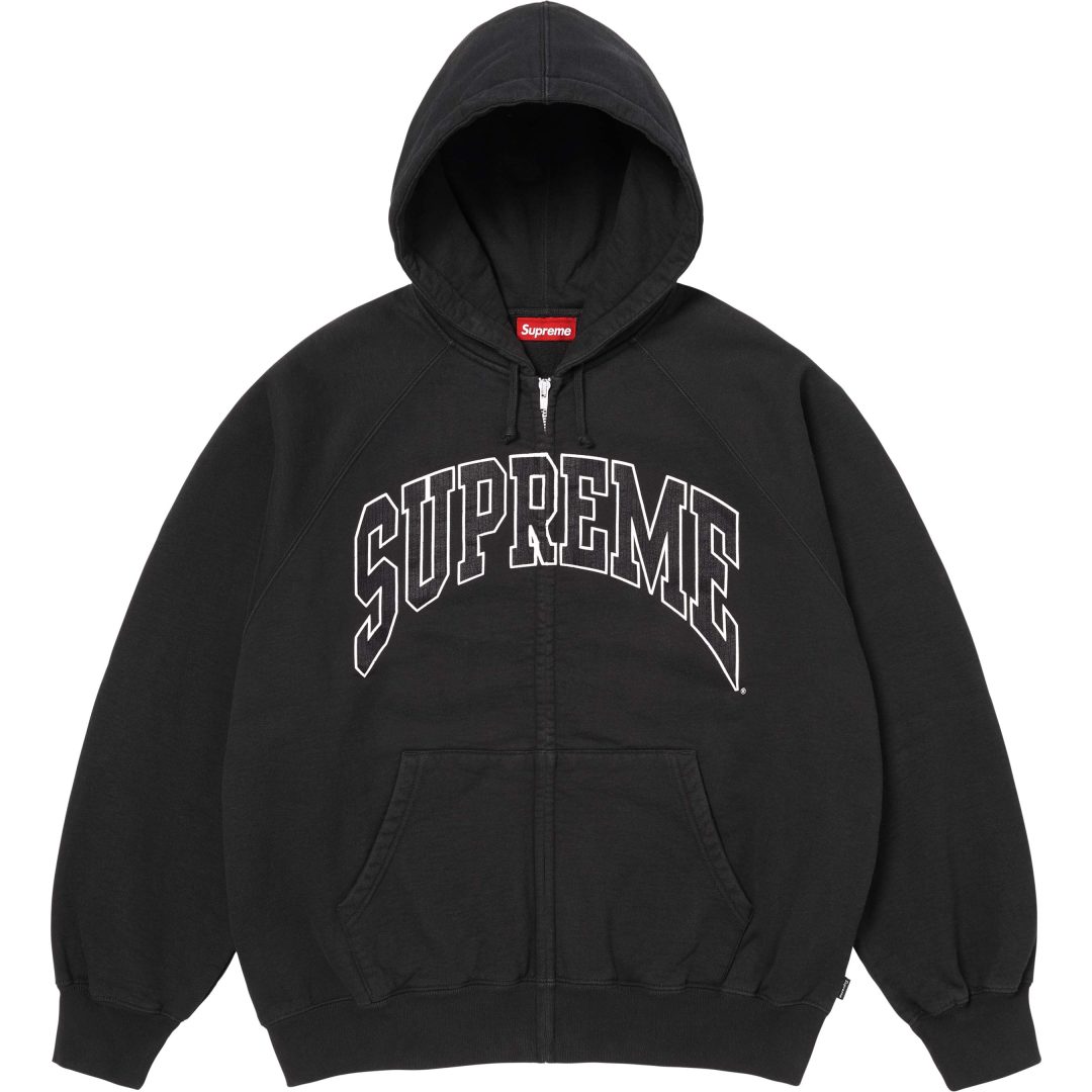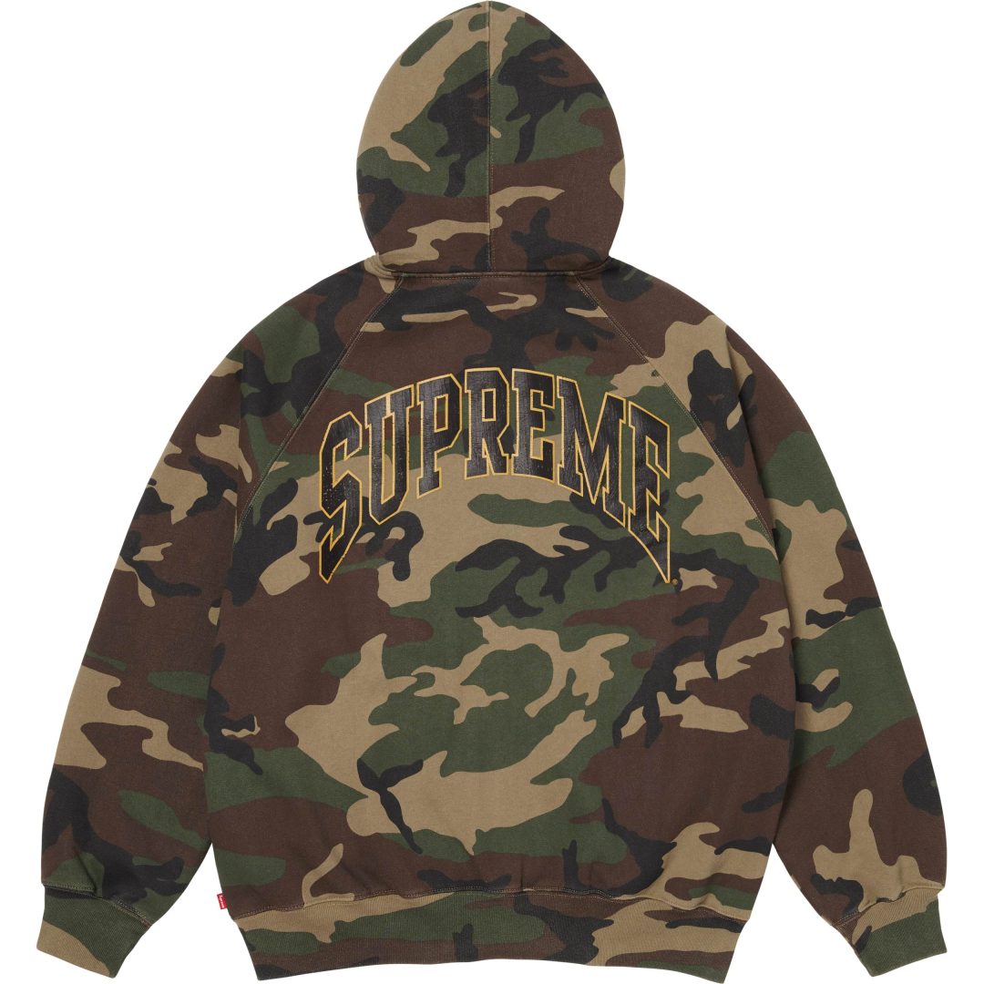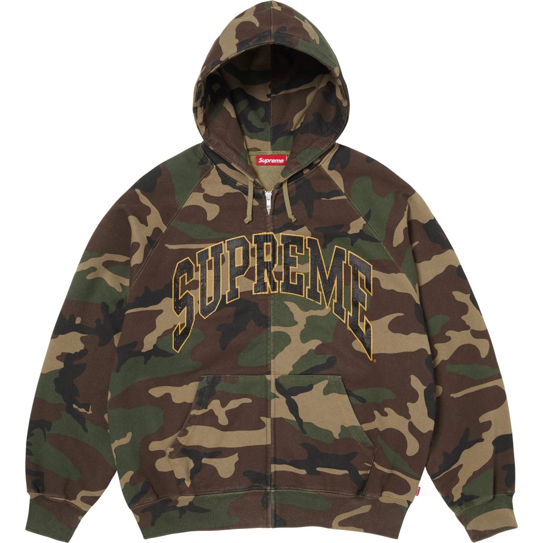 ひび割れ加工が施されたロゴが胸元と背中に配置されたラグランスリーブ仕様のジップアップフーディー
