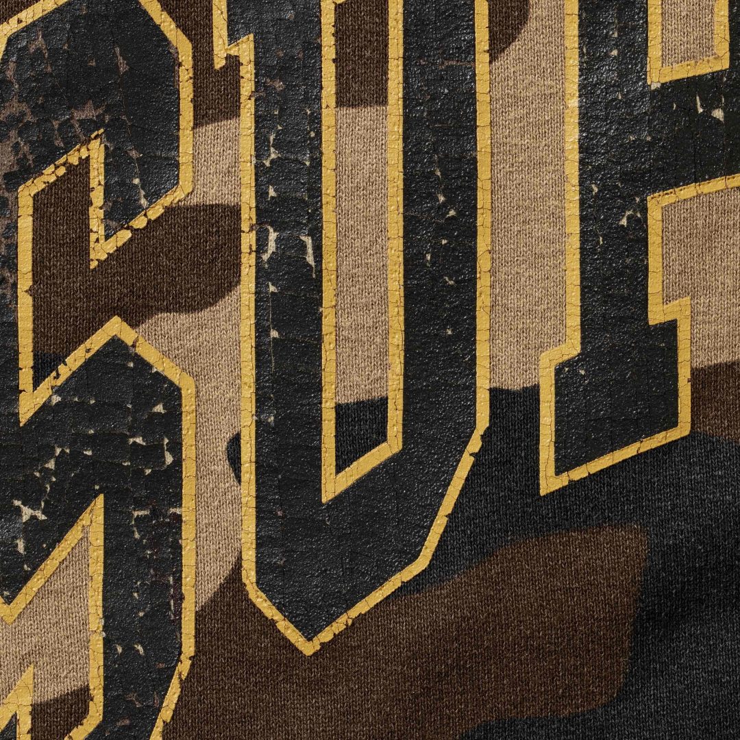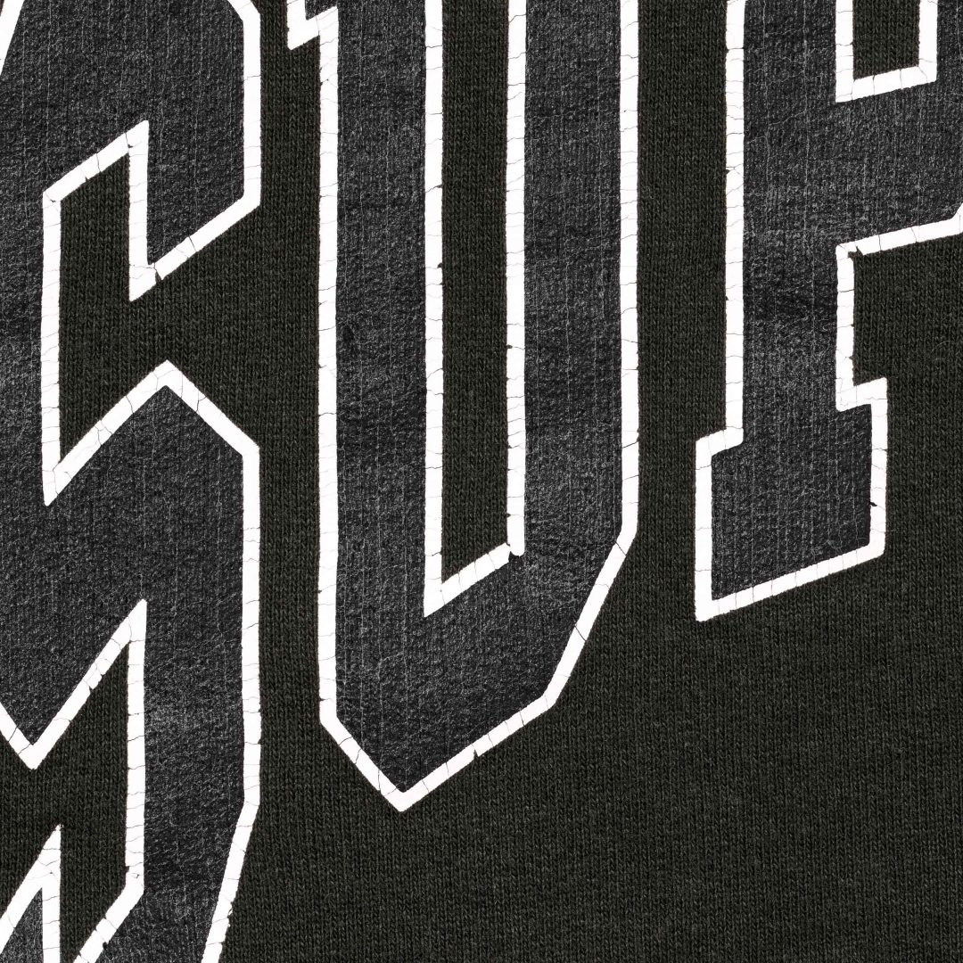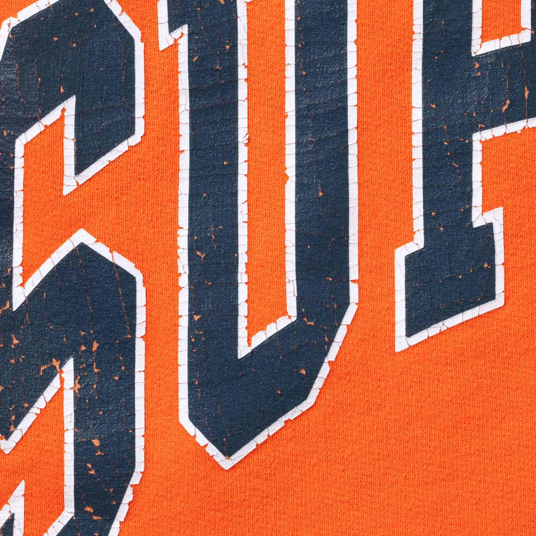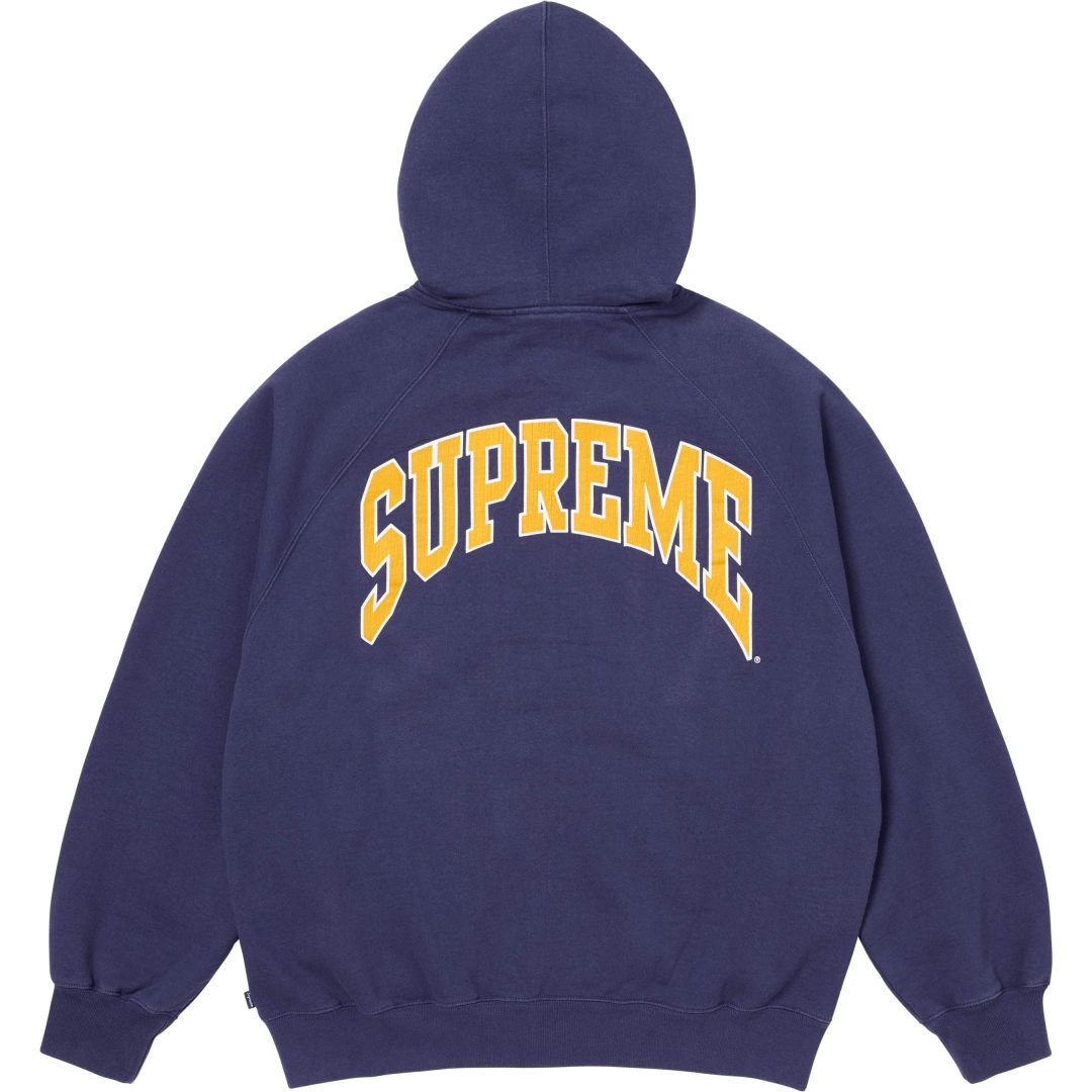 ひび割れ加工が施されたロゴが胸元と背中に配置されたラグランスリーブ仕様のジップアップフーディー