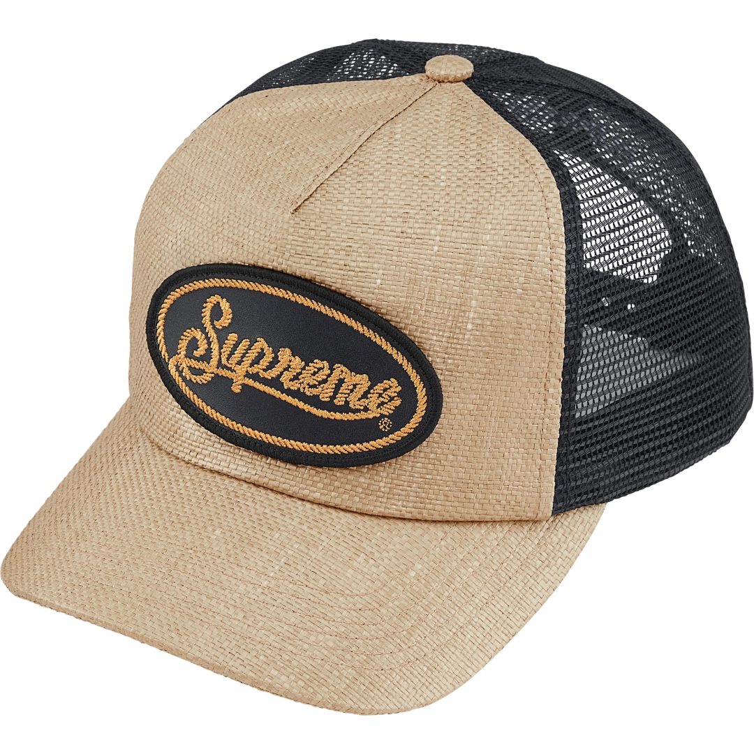 フロントパーツがラファヤシ素材になったメッシュバック5パネルキャップ