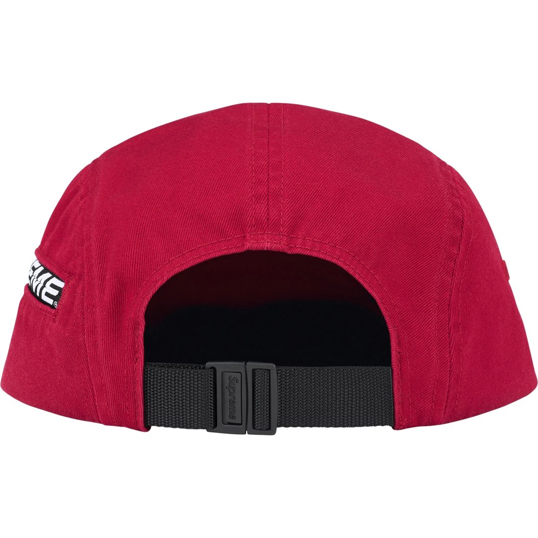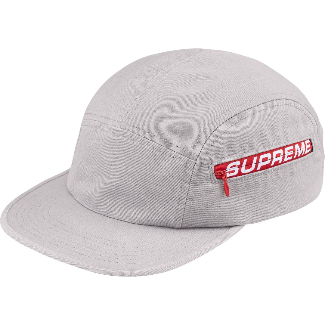ロゴ入りのジップポケットが左側面に配置されたキャンプキャップ